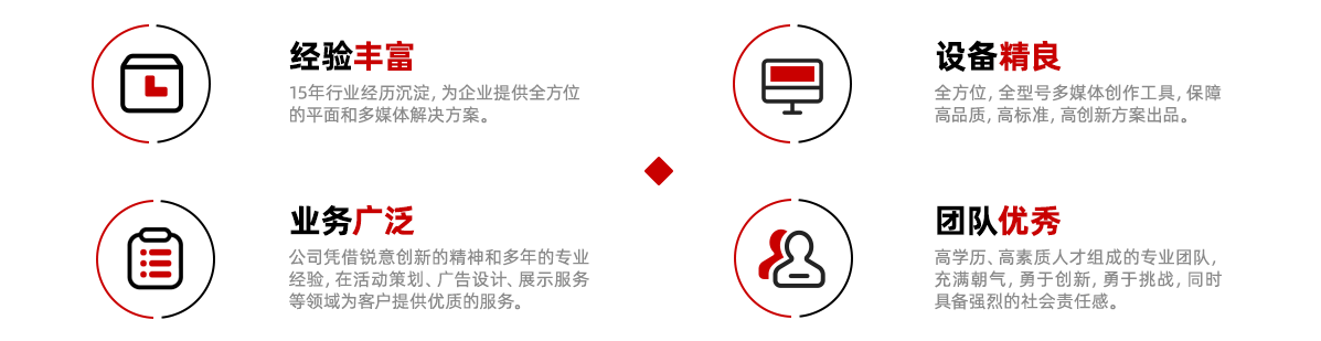 憑借銳意創(chuàng)新的精神和多年的專業(yè)經(jīng)驗(yàn),在活動策劃、廣告設(shè)計(jì)、展示服務(wù)等領(lǐng)域?yàn)榭蛻籼峁﹥?yōu)質(zhì)的服務(wù)。